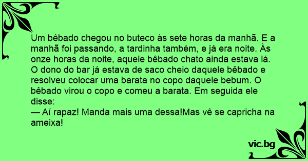 Um bêbado chegou no buteco às sete horas da manhã. E a manhã foi passando, a tardinha também, e já era noite. Às onze horas da noite, aquele bêbado chato ainda estava lá. O dono do bar já estava de saco cheio daquele bêbado e resolveu colocar uma barata no copo daquele bebum. O bêbado virou o copo e comeu a barata. Em seguida ele disse: