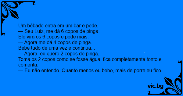 — Eu não entendo. Quanto menos eu bebo, mais de porre eu fico.