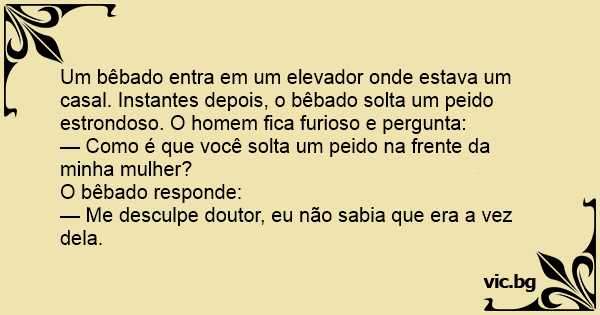 Um bêbado entra em um elevador onde estava um casal. Instantes depois, o bêbado solta um реidо estrondoso. O homem fiса furioso e pergunta: