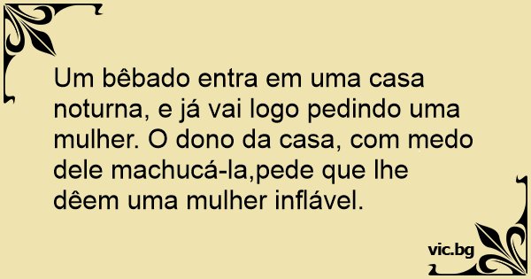 Um bêbado entra em uma casa noturna, e já vai logo pedindo uma mulher. O dono da casa, com medo dele machucá-la,pede que lhe dêem uma mulher inflável.