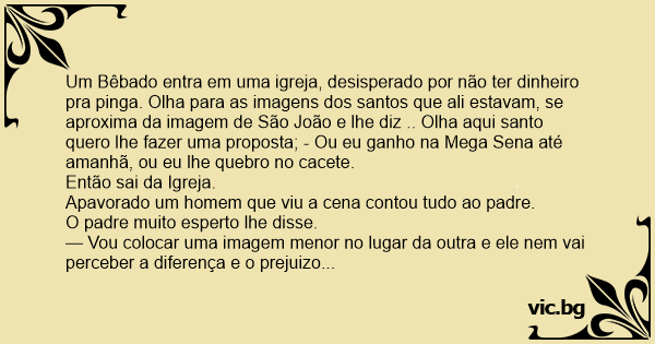 Um Bêbado entra em uma igreja, desisperado por não ter dinheiro pra pinga. Olha para as imagens dos santos que ali estavam, se aproxima da imagem de São João e lhe diz .. Olha aqui santo quero lhe fazer uma proposta; - Ou eu ganho na Mega Sena até amanhã, ou eu lhe quebro no сасете.
