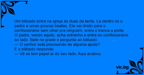O padre, vendo aquilo, acha estranho e entra no confissionário ao lado. Bate na grade e pergunta ao bêbado: