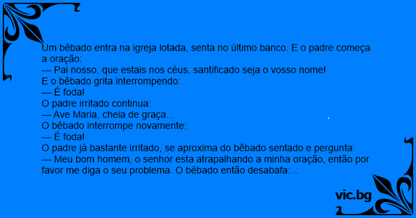 — Meu bom homem, o senhor esta atrapalhando a minha oração, então por favor me diga o seu problema. O bêbado então desabafa: