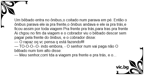 Um bêbado entra no ônibus,o coitado num parava em pé. Então o ônibus parava ele ia pra frente,o ônibus andava e ele ia pra trás,e ficou assim por toda viagem Pra frente pra trás,para tras pra frente Ai chgou no fim da viagem e o cobrador viu o bêbado descer sem pagar pela frente do ônibus, e o cobrador disse: