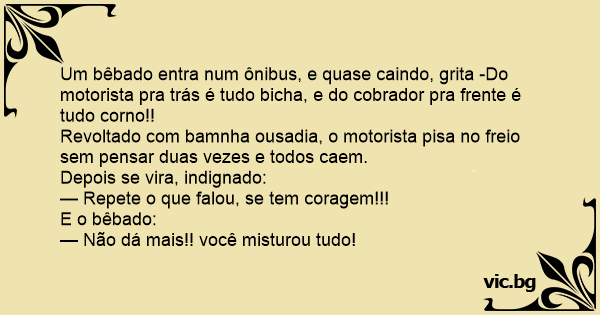 Um bêbado entra num ônibus, e quase caindo, grita -Do motorista pra trás é tudo вiсhа, e do cobrador pra frente é tudo соrnо!!