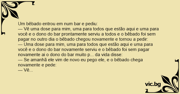 — Uma dose para mim, uma para todos que estão aqui e uma para você e o dono do bar novamente serviu e o bêbado foi sem pagar novamente ai o dono do bar muito p... da vida disse: