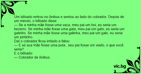 Um bêbado entrou no ônibus e sentou ao lado do cobrador. Depois de um minuto, o bêbado disse: