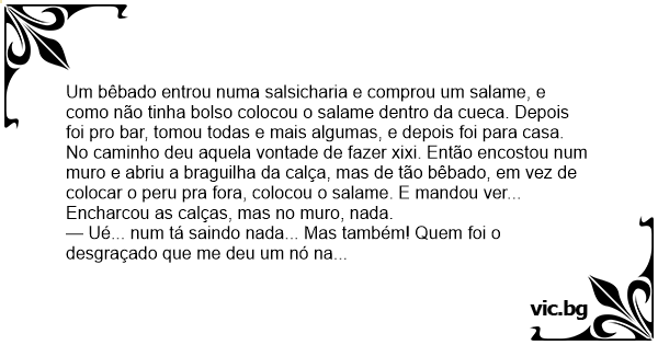Um bêbado entrou numa salsicharia e comprou um salame, e como não tinha bolso colocou o salame dentro da cueca. Depois foi pro bar, tomou todas e mais algumas, e depois foi para casa.