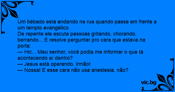 Um bêbado está andando na rua quando passa em frente a um templo evangélico.
