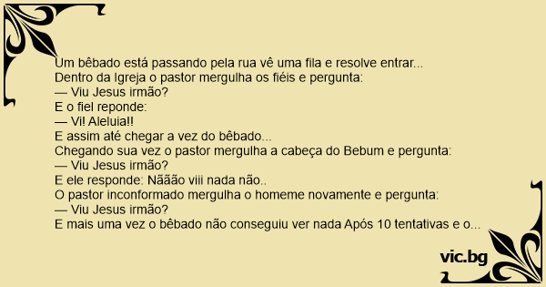 E mais uma vez o bêbado não conseguiu ver nada Após 10 tentativas e o pastor inconformado ia mergulhando o bêbado outra vez quando o bebum o segura e diz: