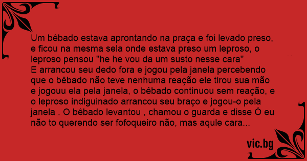 Um bêbado estava aprontando na praça e foi levado preso, e ficou na mesma sela onde estava preso um leproso, o leproso pensou "he he vou da um susto nesse cara"