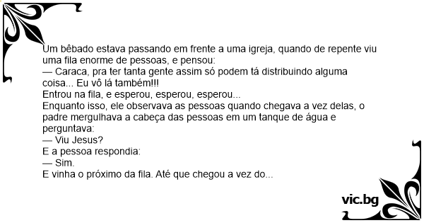 Depois de muitas tentativas, e a mesma resposta do bêbado, o padre foi tentar a última vez. Mergulhou a cabeça do bêbado, e deixou por alguns segundos até que ele ficasse sem ar. E por fim perguntou: