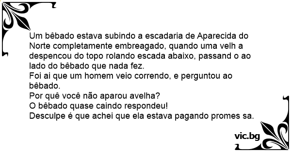 Um bêbado estava subindo a escadaria de Aparecida do Norte completamente embreagado, quando uma velh a despencou do topo rolando escada abaixo, passand o ao lado do bêbado que nada fez.