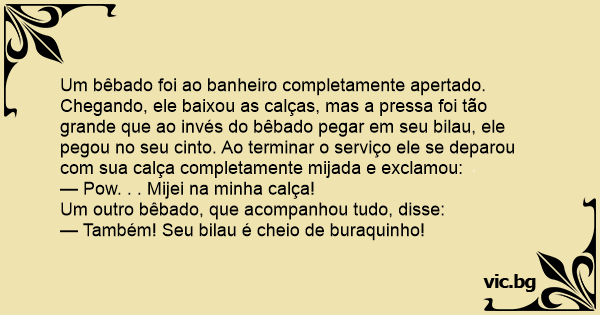 Um bêbado foi ao banheiro completamente apertado. Chegando, ele baixou as calças, mas a pressa foi tão grande que ao invés do bêbado pegar em seu bilau, ele pegou no seu cinto. Ao terminar o serviço ele se deparou com sua calça completamente mijada e exclamou: