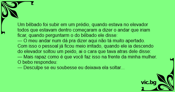 Um bêbado foi subir em um prédio, quando estava no elevador todos que estavam dentro começaram a dizer o andar que iriam ficar, quando perguntarm o do bêbado ele disse: