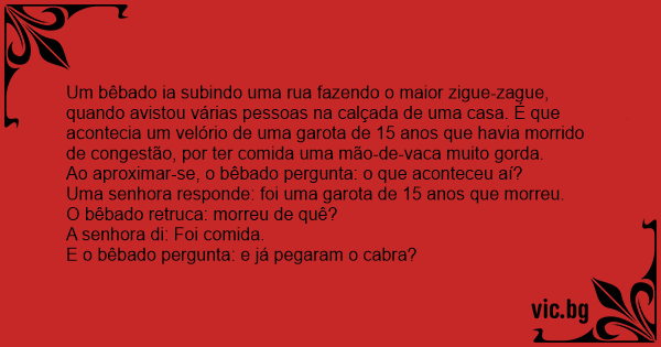 Um bêbado ia subindo uma rua fazendo o maior zigue-zague, quando avistou várias pessoas na calçada de uma casa. É que acontecia um velório de uma garota de 15 anos que havia morrido de congestão, por ter comida uma mão-de-vаса muito gorda.