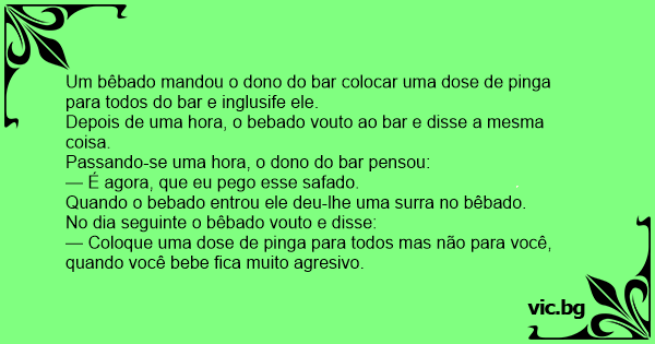 O cara chega no bar do bairro que onde ele era novato e fala. Ei! dono do bar, bote uma pinga pra mim, uma para aquele rapaz alí,outra pro meu novo vizinho aqui, e uma pra você também dono do bar,...