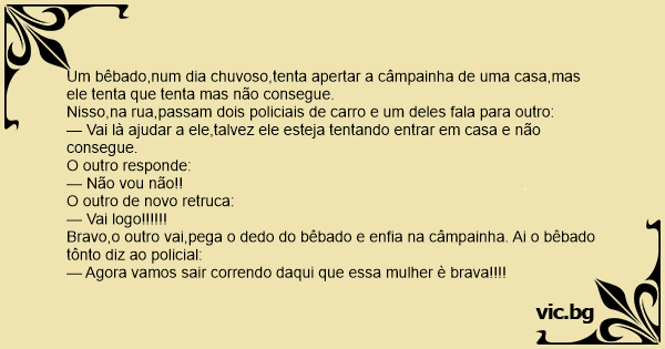 Bravo,o outro vai,pega o dedo do bêbado e enfia na câmpainha. Ai o bêbado tônto diz ao policial: