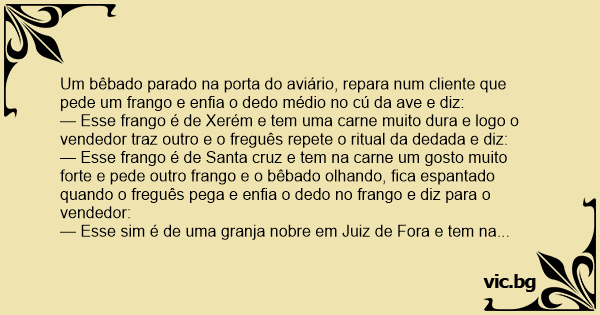 — Esse frango é de Santa cruz e tem na carne um gosto muito forte e pede outro frango e o bêbado olhando, fiса espantado quando o freguês pega e enfia o dedo no frango e diz para o vendedor:
