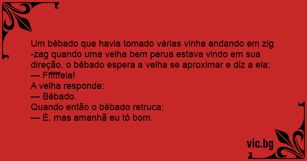 Um bêbado que havia tomado várias vinha andando em zig-zag quando uma velha bem perua estava vindo em sua direção, o bêbado espera a velha se aproximar e diz a ela: