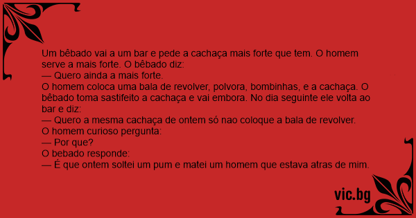 Um bêbado vai a um bar e pede a cachaça mais forte que tem. O homem serve a mais forte. O bêbado diz: