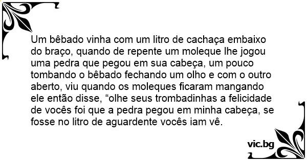Um bêbado vinha com um litro de cachaça embaixo do braço, quando de repente um moleque lhe jogou uma pedra que pegou em sua cabeça, um pouco tombando o bêbado fechando um olho e com o outro aberto, viu quando os moleques ficaram mangando ele então disse, “olhe seus trombadinhas a felicidade de vocês foi que a pedra pegou em minha cabeça, se fosse no litro de aguardente vocês iam vê.