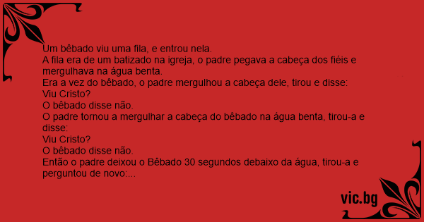 Era a vez do bêbado, o padre mergulhou a cabeça dele, tirou e disse: