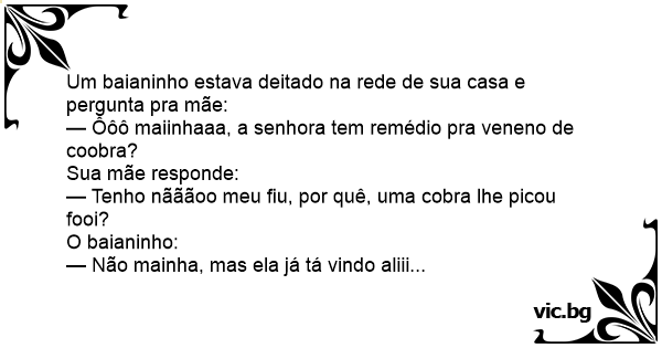 — Ôôô maiinhaaa, a senhora tem remédio pra veneno de coobra?