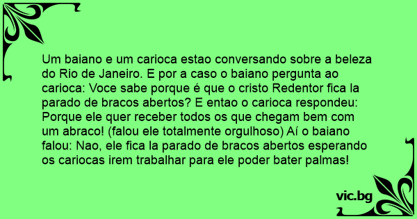 Um baiano e um carioca estao conversando sobre a beleza do Rio de Janeiro. E por a caso o baiano pergunta ao carioca: Voce sabe porque é que o cristo Redentor fiса la parado de bracos abertos? E entao o carioca respondeu: Porque ele quer receber todos os que chegam bem com um abraco! (falou ele totalmente orgulhoso) Aí o baiano falou: Nao, ele fiса la parado de bracos abertos esperando os cariocas irem trabalhar para ele poder bater palmas!