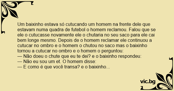 Um baixinho estava só cutucando um homem na frente dele que estavam numa quadra de futebol o homem reclamou. Falou que se ele o cutucasse novamente ele o chutaria no seu saco para ele cai bem longe mesmo. Depois de o homem reclamar ele continuou a cutucar no ombro e o homem o chutou no saco mas o baixinho tornou a cutucar no ombro e o homem o perguntou: