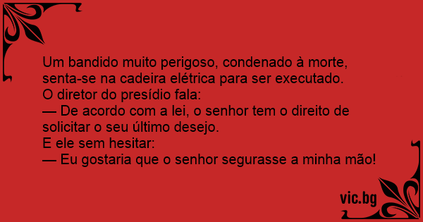 Желба El condenado a muerte y el ultimo deseo На електрическият стол!!! Начальник тюрьмы обращается к смертнику сидящему на электрическом стуле: A priests asks the convicted murderer at the electric chair, "Do you have any last requests?" Den dödsdömde hade tagit plats i elektriska stolen. - Har du någon sista önskan? frågade prästen. - Ja, håll mig i handen. - Min son, har du någon sista önskan? frågade prästen den dödsdömde fången som just tagit plats i elektriska stolen - Ja, sa den dödsdömde. Håll mig i handen. En mördare sitter fastspänd i den elektriska stolen och skall strax bli avrättad. - Har du någon sista önskan, min son? Frågar prästen. Mördaren svarar, - Ja, vill du hålla min hand? Auf dem Weg zum Elektrischen Stuhl fragt der Gefängnisdirektor den Todeskandidaten: "Haben Sie vielleicht noch einen allerletzten Wunsch?" "Ja, Herr Direktor: Würden Sie bitte, wenn's soweit ist,... Fången har tagit plats i elektriska stolen och prästen frågar: - Har du någon sista önskan? - Jaa, håll mig i handen... - Co mógłbym dla pana zrobić? - prokurator pyta recydywistę siedzącego na fotelu elektrycznym. - Czy mógłby pan potrzymać mnie za rękę? - prosi skazaniec. Een boef krijgt de elektrische stoel als straf vanwege vele gruwelijke daden. Op het moment dat het gaat gebeuren vraagt de agent aan de boef “Heb je nog een laatste wens voordat we je... El jefe de la cárcel se dirige al preso que está en la silla eléctrica: - ¿Su último deseo? - Cógeme de la mano por favor. Así voy a sentirme más tranquilo. o padre foi visitar o condenado a morte na cadeira elétrica -como você vai morrer, tens direito a um último pedido...dis o padre -sim, o senhor fica segurando minha mão? Nos Estados Unidos, um padre diz para o condenado à morte que já está todo amarrado na cadeira elétrica: — Estou aqui para ajudá-lo. Se você precisar de alguma coisa, pode pedir! — Ah, vocês falam... A töbszörös gyilkossággal vádolt személyt villamos székbe ültetik. - Van valami utolsó kívánsága? - mondja az őr. - Igen. - És mi? - Megfogná a kezem? Un oltean e condamnat la moarte prin electrocutare. Este asezat pe scaunul electric si intrebat care e ultima lui dorinta. Olteanul raspunde: - Sa ma tineti de mina. Præsten til fangen, der sidder i den elektriske st Præsten til fangen, der sidder i den elektriske stol Umiddelbart før henrettelsen: - "Har du et sidste ønske?" - "Ja, hold mig i hånden." Cietuma priekšnieks jautā uz nāvi notiesātajam elektriskajā krēslā: - Kāda ir jūsu pēdējā vēlēšanās? - Paturiet, lūdzu, mani aiz rokas, tā es jutīšos drošāk. The following conversation took place while a prisoner was awaiting execution by electric chair. Priest: Do you have any last requests? Prisoner: Yes I do, can I hold your hand? Žudikas ruošiamas egzekucijai – už jo nusikaltimus jis nuteistas mirties bausme elektros kėdėje. Teisėjas taria paskutinius žodžius: - Turit kokį paskutinį prašymą? - Taip. Kai mane krės, gal...