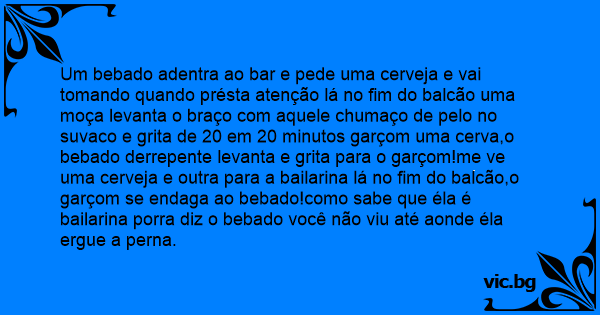 Um bebado adentra ao bar e pede uma cerveja e vai tomando quando présta atenção lá no fim do balcão uma moça levanta o braço com aquele chumaço de pelo no suvaco e grita de 20 em 20 minutos garçom uma cerva,o bebado derrepente levanta e grita para o garçom!me ve uma cerveja e outra para a bailarina lá no fim do balcão,o garçom se endaga ao bebado!como sabe que éla é bailarina роrrа diz o bebado você não viu até aonde éla ergue a perna.