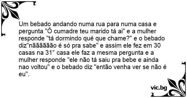 Um bebado andando numa rua para numa casa e pergunta "Ô cumadre teu marido tá ai" e a mulher responde "tá dormindo qué que chame?" e o bebado diz"nãããããão é só pra sabe" e assim ele fez em 30 casas na 31° casa ele faz a mesma pergunta e a mulher responde "ele não tá saiu pra bebe e ainda nao voltou" e o bebado diz "então venha ver se não é eu".