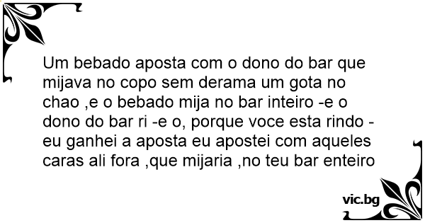 Um bebado aposta com o dono do bar que mijava no copo sem derama um gota no chao ,e o bebado mija no bar inteiro -e o dono do bar ri -e o, porque voce esta rindo -eu ganhei a aposta eu apostei com aqueles caras ali fora ,que mijaria ,no teu bar enteiro