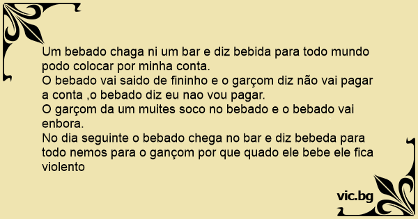 No dia seguinte o bebado chega no bar e diz bebeda para todo nemos para o gançom por que quado ele bebe ele fiса violento