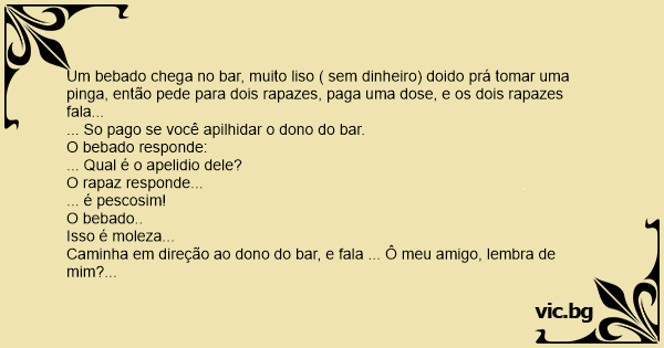Um bebado chega no bar, muito liso ( sem dinheiro) doido prá tomar uma pinga, então pede para dois rapazes, paga uma dose, e os dois rapazes fala...