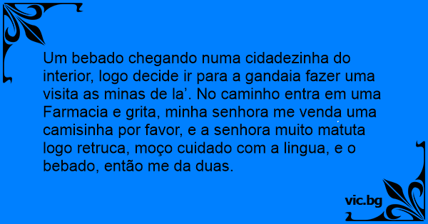 Um bebado chegando numa cidadezinha do interior, logo decide ir para a gandaia fazer uma visita as minas de la’. No caminho entra em uma Farmacia e grita, minha senhora me venda uma camisinha por favor, e a senhora muito matuta logo retruca, moço cuidado com a lingua, e o bebado, então me da duas.