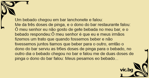 Me da três doses de pinga, e o dono do bar restaurante falou: Ô meu senhor eu não gosto de gete bebada no meu bar, e o bebado respondeu:Ô meu senhor é que eu e meus irmãos fizemos um trato que quando fossemos beber e não tivessemos juntos tiamos que beber para o outro, emtão o dono do bar serviu as tr6es doses de pinga para o bebado, no outro dia o bebado chegou no bar e falou me de duas doses de pinga o dono do bar falou: Meus pesamos eo bebado respondeu:Meus pesamos porque, mas seu irmão não moreu, não eu parei de beber.