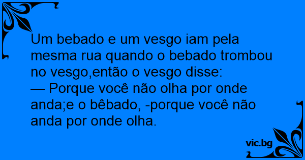 Um bebado e um vesgo iam pela mesma rua quando o bebado trombou no vesgo,então o vesgo disse: