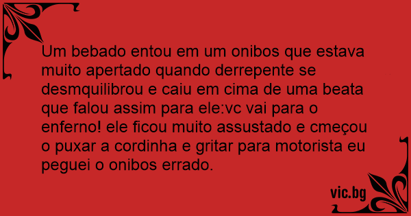 Um bebado entou em um onibos que estava muito apertado quando derrepente se desmquilibrou e caiu em cima de uma beata que falou assim para ele:vc vai para o enferno! ele ficou muito assustado e cmeçou o puxar a cordinha e gritar para motorista eu peguei o onibos errado.