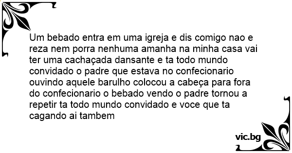 Um bebado entra em uma igreja e dis comigo nao e reza nem роrrа nenhuma amanha na minha casa vai ter uma cachaçada dansante e ta todo mundo convidado o padre que estava no confecionario ouvindo aquele barulho colocou a cabeça para fora do confecionario o bebado vendo o padre tornou a repetir ta todo mundo convidado e voce que ta cagando ai tambem