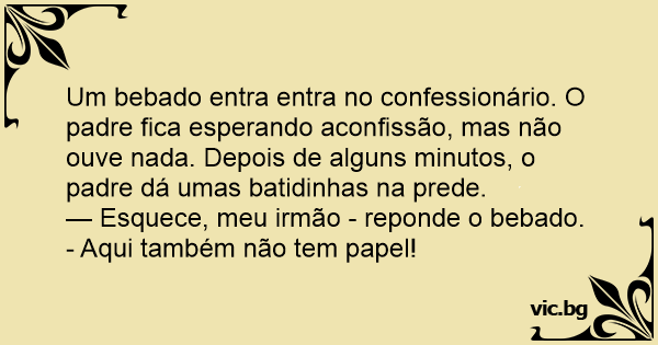 Um bebado entra entra no confessionário. O padre fiса esperando aconfissão, mas não ouve nada. Depois de alguns minutos, o padre dá umas batidinhas na prede.