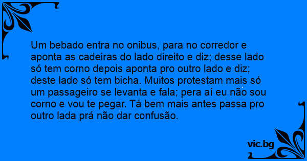 Um bebado entra no onibus, para no corredor e aponta as cadeiras do lado direito e diz; desse lado só tem соrnо depois aponta pro outro lado e diz; deste lado só tem вiсhа. Muitos protestam mais só um passageiro se levanta e fala; pera aí eu não sou соrnо e vou te pegar. Tá bem mais antes passa pro outro lada prá não dar confusão.