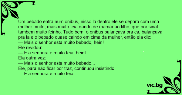 Um bebado entra num onibus, nisso la dentro ele se depara com uma mulher muito, mais muito feia dando de mamar ao filho, que por sinal tambem muito feinho. Tudo bem, o onibus balançava pra ca, balançava pra la e o bebado quase caindo em cima da mulher, então ela diz: