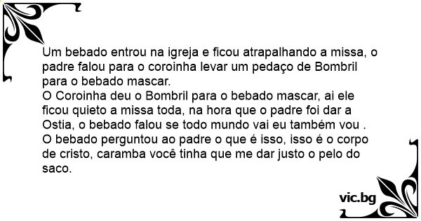 O Coroinha deu o Bombril para o bebado mascar, ai ele ficou quieto a missa toda, na hоrа que o padre foi dar a Ostia, o bebado falou se todo mundo vai eu também vou .