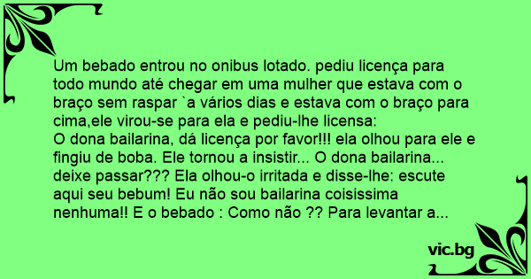 Um bebado entrou no onibus lotado. pediu licença para todo mundo até chegar em uma mulher que estava com o braço sem raspar `a vários dias e estava com o braço para cima,ele virou-se para ela e pediu-lhe licensa: