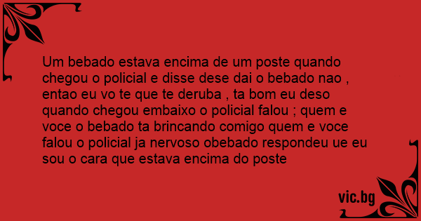 Um bebado estava encima de um poste quando chegou o policial e disse dese dai o bebado nao , entao eu vo te que te deruba , ta bom eu deso quando chegou embaixo o policial falou ; quem e voce o bebado ta brincando comigo quem e voce falou o policial ja nervoso obebado respondeu ue eu sou o cara que estava encima do poste