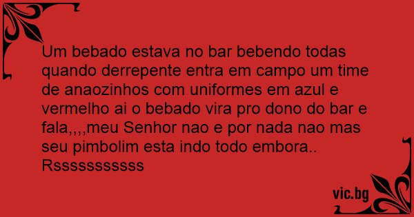 Um bebado estava no bar bebendo todas quando derrepente entra em campo um time de anaozinhos com uniformes em azul e vermelho ai o bebado vira pro dono do bar e fala,,,,meu Senhor nao e por nada nao mas seu pimbolim esta indo todo embora.. Rsssssssssss