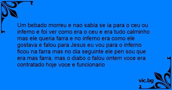 Um bebado morreu e nao sabia se ia para o ceu ou inferno e foi ver como era o ceu e era tudo calminho mas ele queria farra e no inferno era como ele gostava e falou para Jesus eu vou para o inferno ficou na farra mas no dia seguinte ele pen sou que era mas farra, mas o diabo o falou ontem voce era contratado hoje voce e funcionario