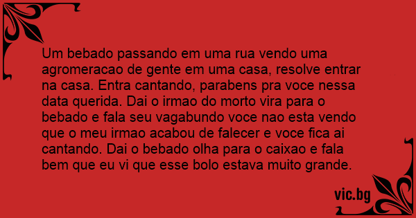 Um bebado passando em uma rua vendo uma agromeracao de gente em uma casa, resolve entrar na casa. Entra cantando, parabens pra voce nessa data querida. Dai o irmao do morto vira para o bebado e fala seu vаgавundо voce nao esta vendo que o meu irmao acabou de falecer e voce fiса ai cantando. Dai o bebado olha para o caixao e fala bem que eu vi que esse bolo estava muito grande.